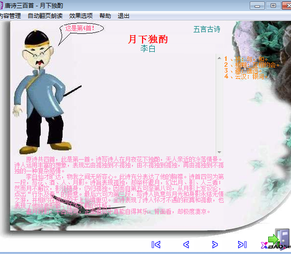 朗读带进度控制,可以同步滚动显示诗文,并且能够自动翻页读诗(按顺序或随机)。 - 更新诗库、注释、评析和作者简介,增加大量详细资料。另新增体裁、韵译和情景图。