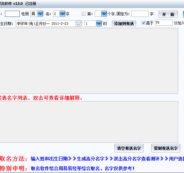宝宝取名软件参考各种书籍、文献、字典,一次产生数千个好名字,您还可根据笔画数、拼音、五行、指定含某字等方式在输出结果里筛选出满意的名字!
